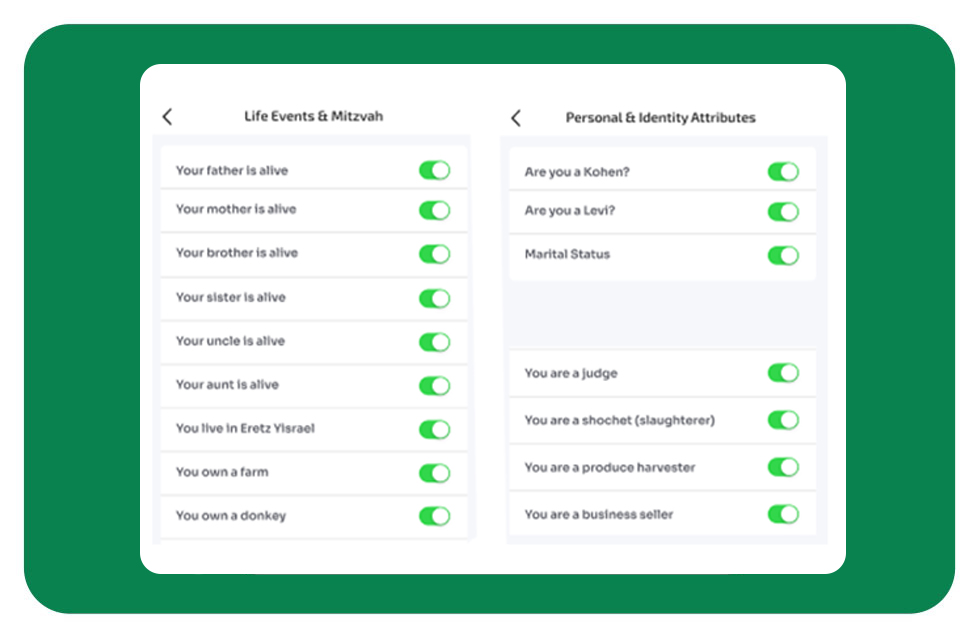 Every person’s path is unique. The app securely asks who you are — Kohen, Levi, marital status, where you live, your family, and more. From there, your mitzvah checklist is tailored only to you. No clutter, no confusion — just the mitzvot that actually apply in your life, right now.