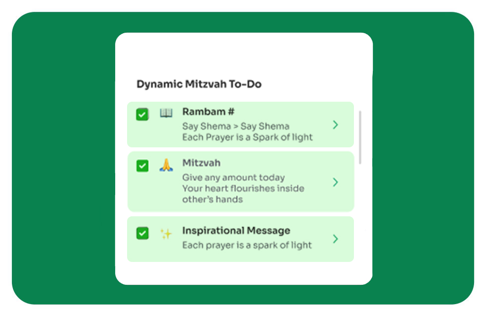 Your checklist refreshes with mitzvot drawn from daily life and the weekly parsha. No guessing, no searching — just open the app and see exactly what Hashem has placed before you today