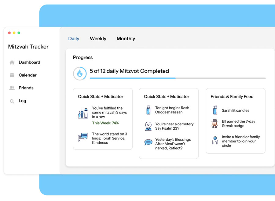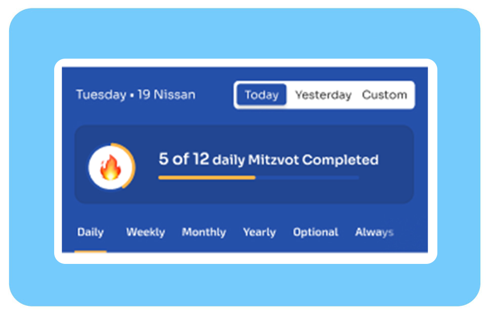 Watch your daily, weekly, and monthly mitzvah streaks build. Celebrate wins, notice patterns, and stay motivated with simple stats that show how your mitzvot are adding up day by day.