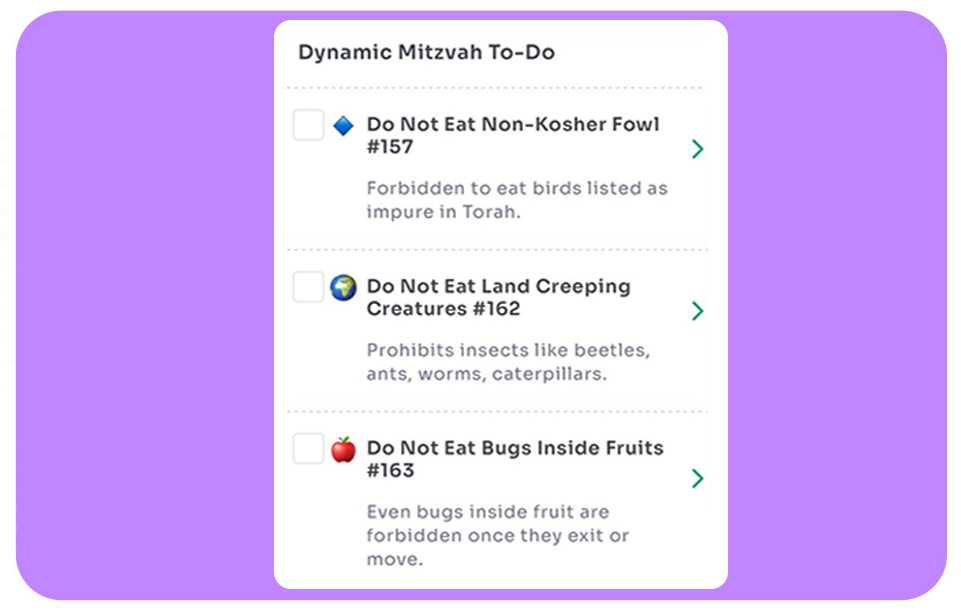 Each mitzvah is clear and doable, whether it’s saying a blessing, giving tzedakah, or honoring someone close to you. Check them off as you go and feel the power of living the Torah in real time.